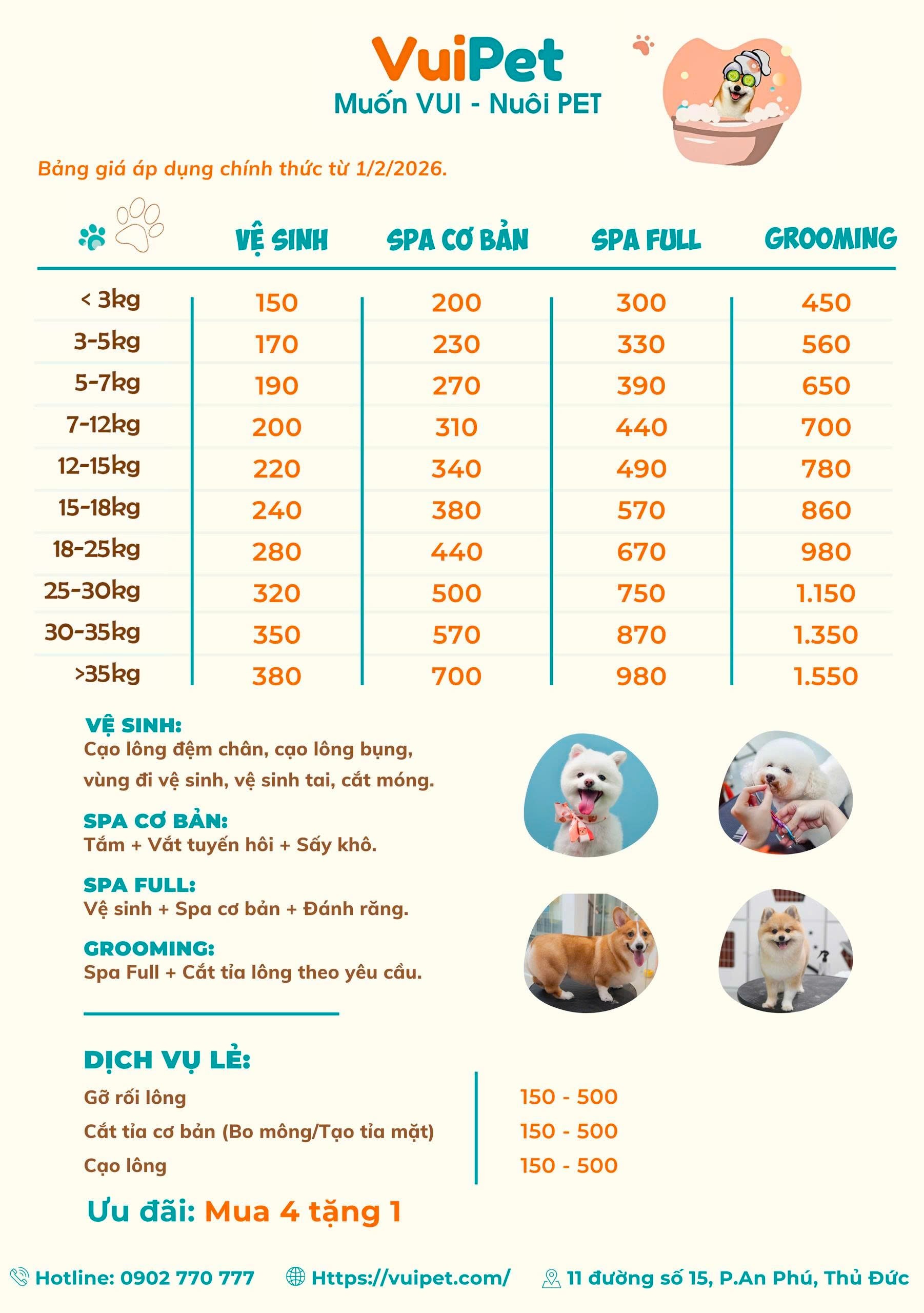 - Ưu đãi áp dụng cho các dịch vụ: Spa 9 bước thơm tho và Grooming cắt tỉa đẹp ngầu.