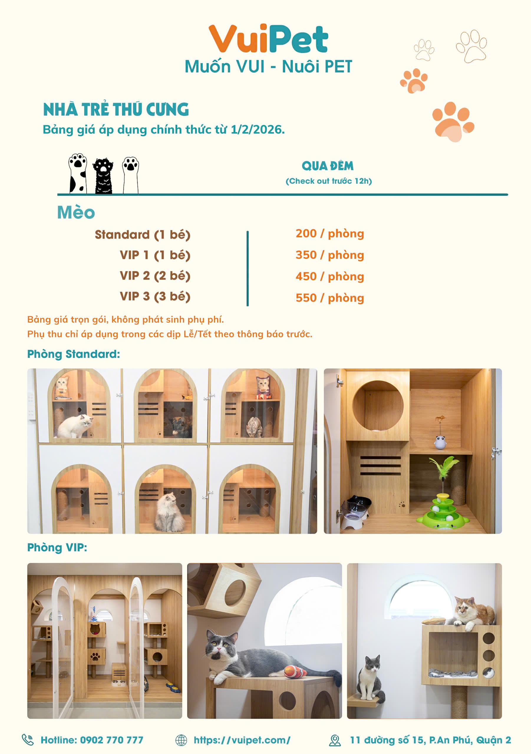 Liên hệ VuiPet để được tư vấn về dịch vụ khách sạn thú cưng ba mẹ nhé.